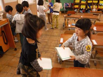 国語科では,教科書に載っている名刺を使って「どうぞよろしく」の自己紹介をしました。また,音楽科では「ぞうさんのさんぽ」「てとてであくしゅ」という音楽に乗せて,握手をしました。教科学習を通じ,友だちとの関わりを少しずつ広げています。