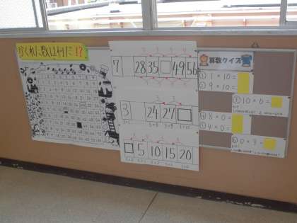 校内のあちこちに,算数に関わる学年掲示があります。数や量に関心がもてるように工夫しています。