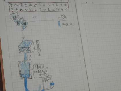 社会科の学習で,浄水場で水をきれいにするまでの工程をノートにまとめました。資料を見ながら,ノートに自分なりにまとめることができていました。