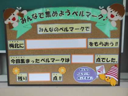 梅津北小学校でベルマークをたくさん集めていくために,かわいらしいベルマークの掲示板をPTAの方々が作成されました。お家でもベルマークを集めていただいて,子どもたちにとって有効活用ができるものを購入できればと考えています。