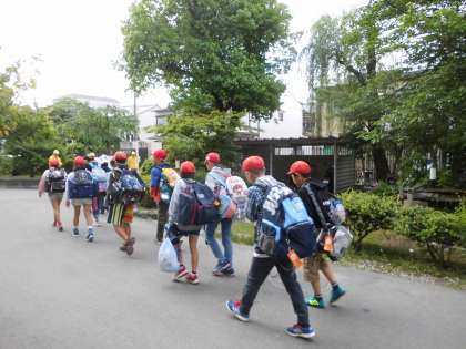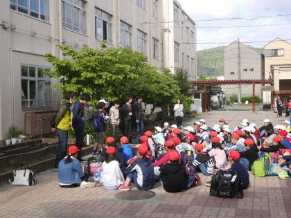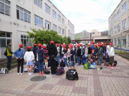 出発式で,引率の先生の紹介がありました。その後,お見送りのお家の方にあいさつをしました。いよいよ,学校を出て出発です。