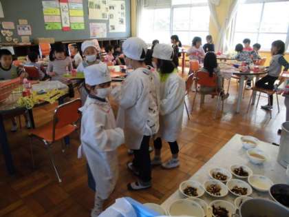 今日は、ランチルームで2−1の皆と一緒に給食をいただきました。「私の一番好きな給食は、カレーです。」「明日の給食は何ですか?」など、いっぱいお話してくれて、美味しそうに食べ、空っぽになったお皿を見せてくれました。