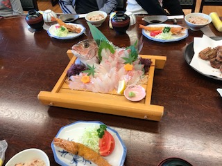 タイのお造り、ゆでダコ、車海老のおどり、車海老のフライ、魚の唐揚げ、タイ飯など、超豪華。いただきます。