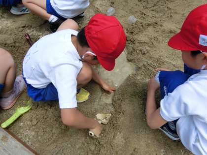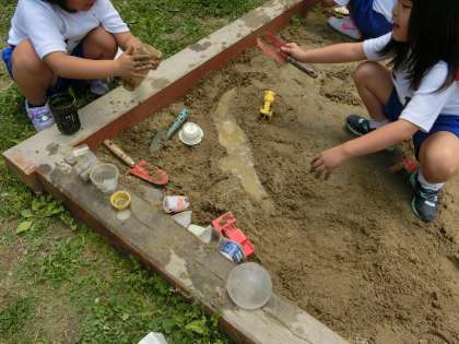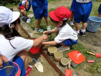 今日は1組が砂遊びをしました。カップに砂を入れて型を取ったり,山を作ったり,川を掘ったり。何といっても楽しいのは,川や池にお水を流すことです。どろんこになって,造形遊びを楽しみました。2組は明日の予定です。