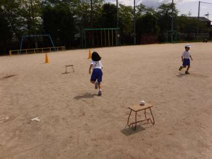 体育科では折り返しリレーを行っています。グループ毎に玉を交互に台から台に乗せて,なかなか白熱した勝負をしています。