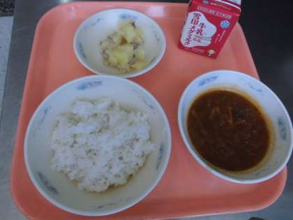 麦ごはん・牛乳・ハッシュドビーフ・ジャーマンポテト