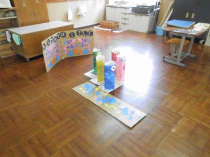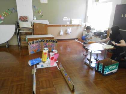 怪獣ボーリングのお店屋さんの練習をしました。「いらっしゃいませ」「ここからどうぞ」「スタート」など,動きながらお店屋さんで言う言葉を確認しました。