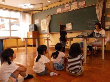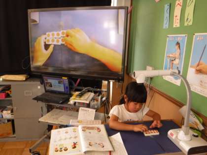 算数科では「いくつといくつ」という単元で,10までの数の分解・合成を学習しています。カメラを使って大型画面に手元の様子を映し出すと,友だちの考えがよく伝わって来たようでした。