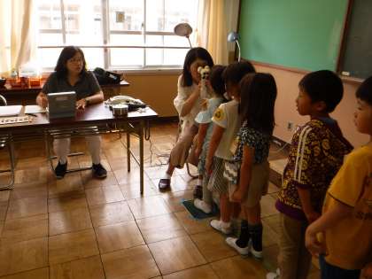 聴力検査はランチルームで棚倉先生と。検査中は静かにじっと検査を受けている友達の様子を見て参考にします。ヘッドホンから音が聞こえたら,手を挙げる姿が初々しいです。