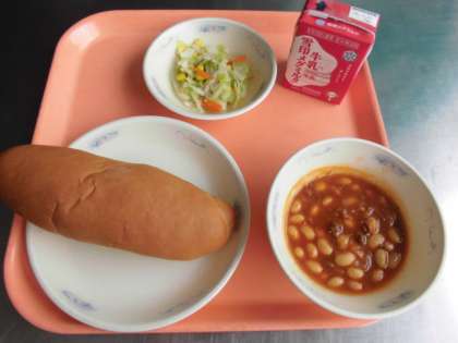 ミルクコッペパン・牛乳・大豆と牛肉のトマト煮・野菜のソテー