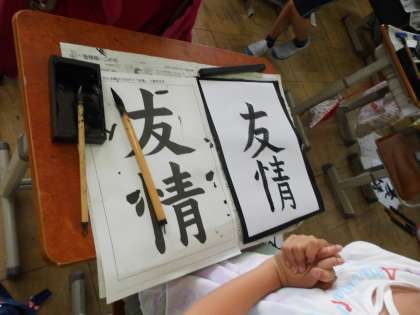 文字の大きさと点画のつながりに気を付けながら,「友情」をかきました。画数が少ない「友」と画数の多い「情」の大きさに難しさを感じながらも,「とめ」や「はらい」に気を付けて書くことができていました。
