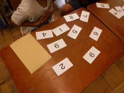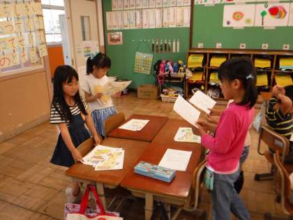 国語科では「はなのみち」という物語文を紙芝居にしました。班で読みあって,大きな声ではきはきと発表することを目指しています。算数科では「いくつといくつ」という単元で,数図ブロックや数字カードなど,いろいろな方法で「10がいくつといくつか」「いくつといくつで10か」ということを考えています。
