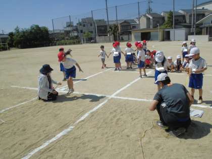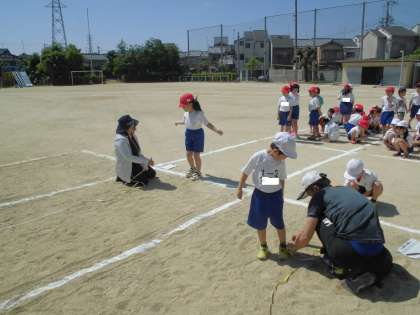 今年度から新体力テストの実施が全学年対象となりました。今日は,1年生が50m走と立ち幅跳びを行いました。ひざを曲げて,勢いをつけて,遠くを目指して跳びました。