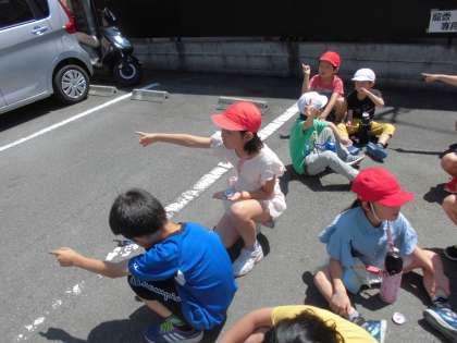今日は四条通の方面に町たんけんに行きました。それぞれ方位磁石をもって,「今,どちらの方向にむかっているのか」「東はどちらか」などを考えながらたんけんしました。四条通沿いにはお店がたくさん並んでいること,車の通行が多いことに気付きました。