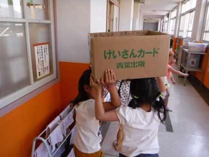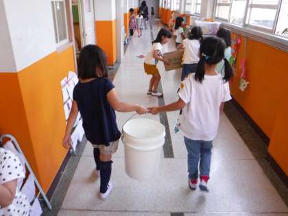 何人かで協力して,渡り廊下のゴミ捨て場まで向かいます。雑紙,燃えるごみ,プラスチックごみと,1年生でもしっかり分別して捨てます。