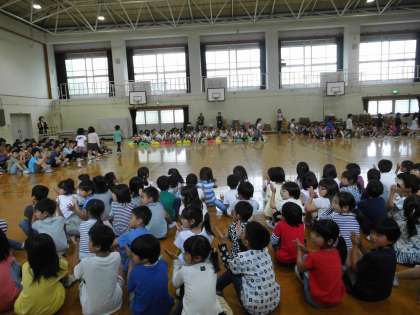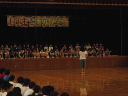 1年生を迎える会を行いました。2〜6年生の拍手の中,1年生が入場しました。2年生から1年生にあさがおの種がプレゼントされた後,6年生代表の初めの言葉で始まりました。