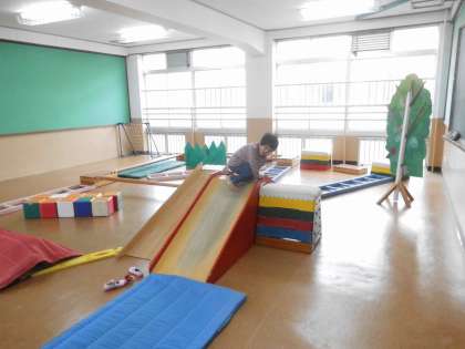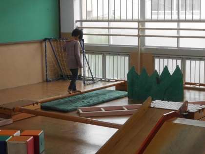 プレイホールで,体のバランスを取る活動を行いました。一本橋のところを慎重にわたりきりました。