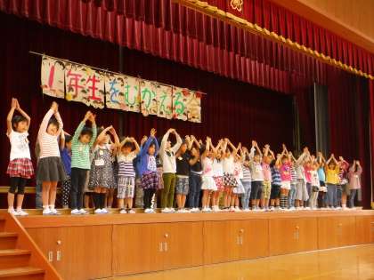 1年生は担任団の伴奏で,全員で振付を踊り,「魔法のおまじない」という歌を歌いました。全校の子どもたち,先生方,参観の保護者の方が,手拍子で温かく後押ししてくれました。