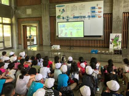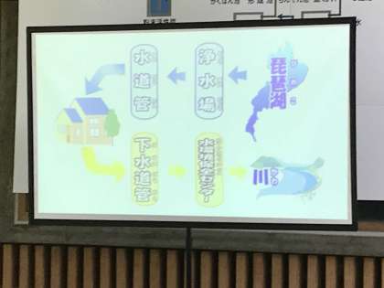 まずは、ビデオによる事前学習です。わたしたちが毎日飲んでいる水は、琵琶湖からきていて、飲み水になるまでにどのような過程があるのかを確認しました。