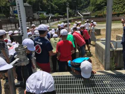 浄水場内の見学です。沈殿池などを見て回っています。進むにつれ,水がきれいになっていってます。