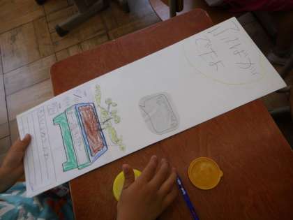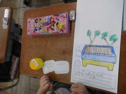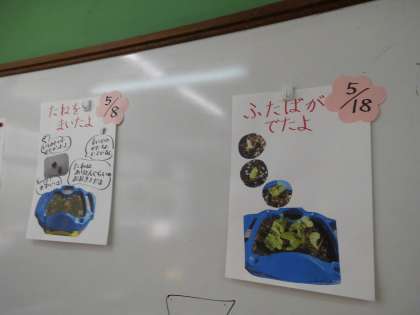 あさがおを観察して,双葉が出た様子を観察カードにかいて貼りました。子どもたちが感じた様子をカードに書いています。