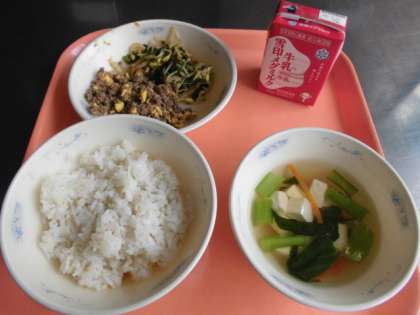 麦ごはん・牛乳・ビビンバ(具)肉と卵・ビビンバ(具)ナムル・とうふと青菜のスープ