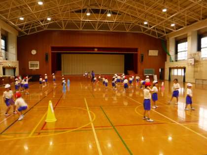 学年合同での体育科に取り組んでいます。種目は「ころがしドッヂボール」です。素早くスローをしたり,反対側で待ち受けたりしながら,コートの外から内野を当てることを目指しています。