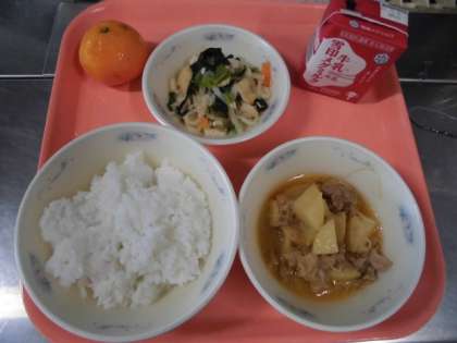 ごはん・肉じゃが(ピリ辛みそ味)・千切大根の煮つけ(打ち豆入り)・みかん