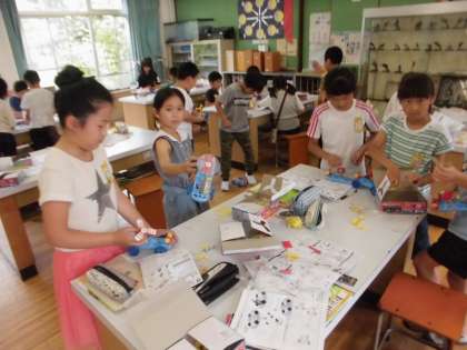 電池のはたらきを学習して,電池を使ったおもちゃを考えました。モーターに羽根をつけたり,車にして走らせたりして工夫しながら作っていました。