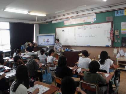 CDから流れてくる二人の会話から,誕生日や好きなことをを聞き取りました。CDで聞き取れないときには,マシュー先生がゆっくりと話した言葉から内容を聞き取っていました。