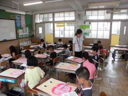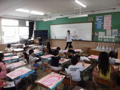 歯磨きの絵で,口の中や背景を絵の具を使って塗りました。絵の具を使うときの筆の使い方や筆洗の使い方をしっかりと聞いて,初めての筆に緊張して色をぬっていました。