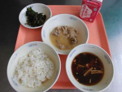 麦ごはん・牛乳・鶏肉のあまから煮・ほうれん草のおかか煮・赤だし