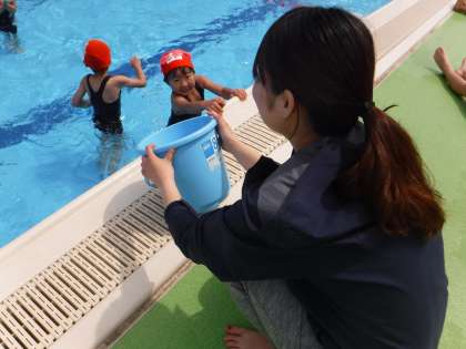 ボランティアの先生にも見守られながら,精一杯頑張って水の感触を楽しんだ1年生です。でも,ちょっと水が冷たかったようです。合間の休憩には,日向ぼっこして気持ちよさそうな表情でした。
