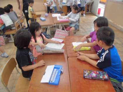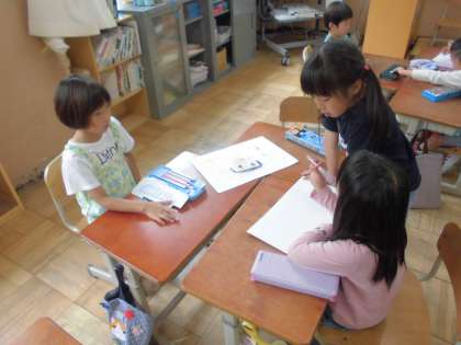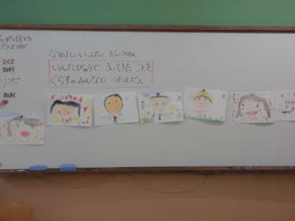 先日,一年生はグループごとに分かれて,校内の教職員にインタビューをしていました。今日は,インタビューした相手の似顔絵をもとに,聞いて分かったことをどのように友だちに伝えるのかの相談をしました。どのグループも,とてもかわいらしい似顔絵がかけていました。