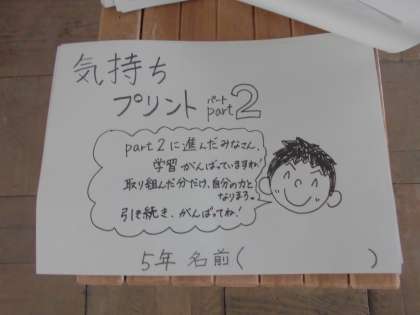 5年生のフリースペースをのぞいてみると,「気持ちプリントPart2」と題した社会や算数の学習プリントがずらっと並んでいました。これから帳合いをし,自主的にどんどん取り組むのでしょうか・・?ぐんぐん力をつけてきている5年生。楽しみです。