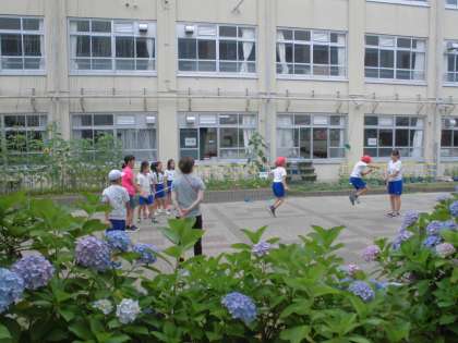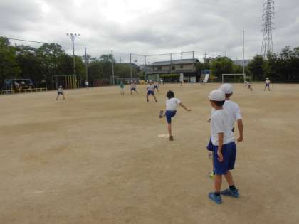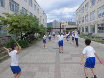 なわとびクラブは,中庭で短縄や長縄に挑戦していました。何回とべるかを数えながら楽しんで活動しています。球技クラブは2コートに分かれてキックベースボールの対戦をしていました。どちらも活気のあるクラブです。