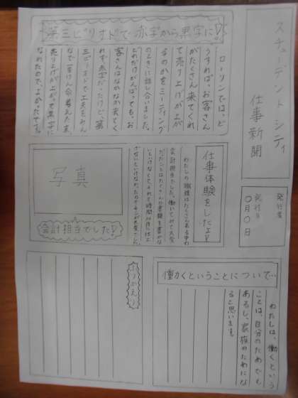 スチューデントシティ学習で学んだことをそれぞれで確認をしました。構成を自分で考え,仕事を通して学んだことを新聞にそれぞれが表しています。
