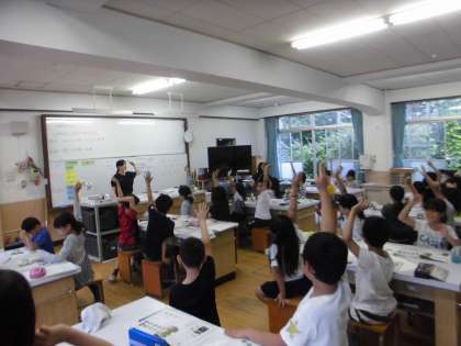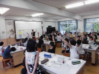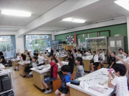 昆虫の成長の仕方や,昆虫が頭・むね・はらに分かれていることや,その他の特徴について学習を振り返りました。たくさんの手が挙がって,しっかりと学習したことを覚えている様子が見られました。