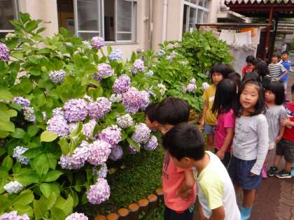 季節は梅雨。雨が小降りになったので,生活科「あめふりわくわく」で,校内の雨を肌で感じてきました。傘を持ってジャンプ!空に吸い込まれそうな1年生です。