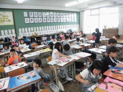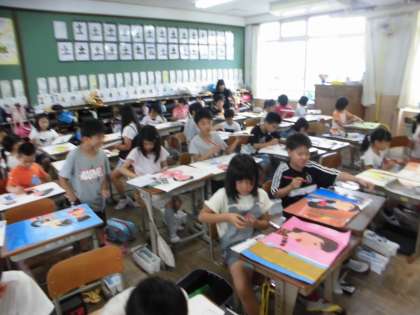 計量の図画の彩色を進めています。絵筆を立てて,細かなところを慎重にぬっていました。