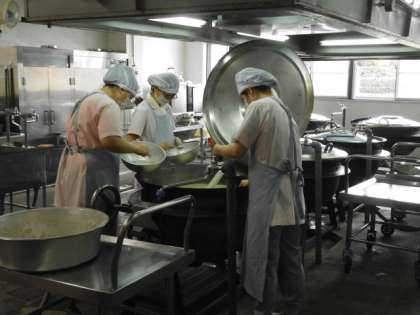 今日の献立の「トマトだご汁」は,給食室で手作りしました。