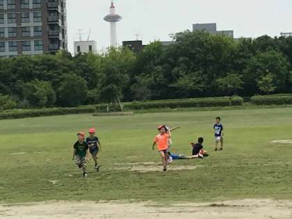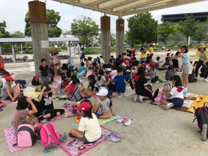 梅小路公園に到着です。20分ほど自由遊びのはずが、疲れたのか,自主的にお弁当のスタンバイです。ステージの日陰の場所がとれました。
