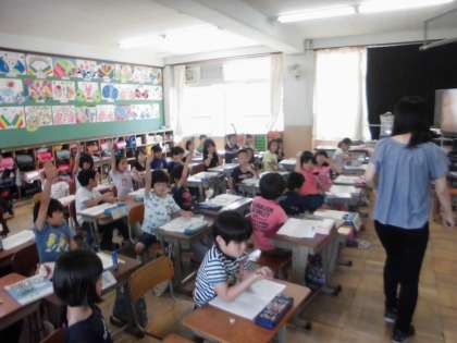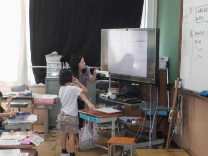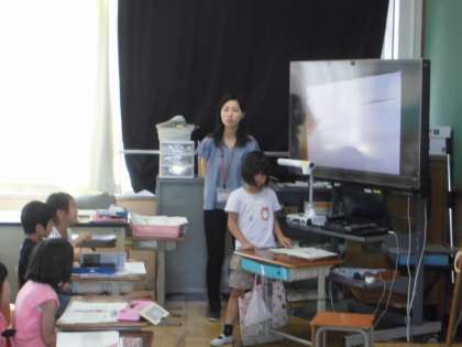 提示装置を使って,自分の考えを説明しています。途中で,「ここまでいいですか」と確認しながら,みんなで理解を深めながら学習をしています。