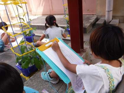 生活科ではアサガオのつぼみを生活科カードに描きました。もう花が咲き始めている子もいますので,明日の朝にも開きそうなつぼみの子もいます。見逃さないように,毎日水をやってほしいと思います。