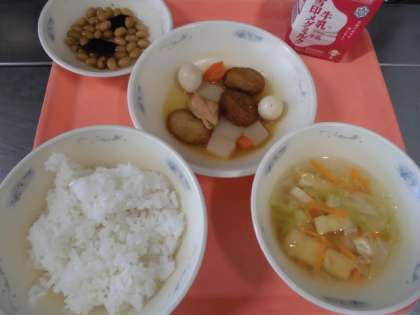 ごはん・牛乳・平天とこんにゃくの煮つけ・こんぶ豆・キャベツのすまし汁