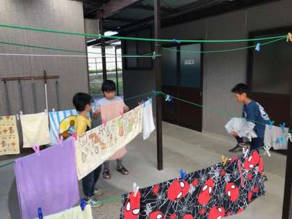 入浴タイムです。今日はたくさんの汗がでたので,とても気持ちよく入りました。夕方になり,涼しい風が吹いてきました。