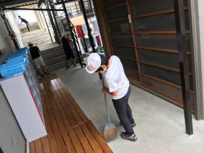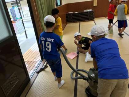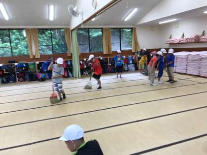 朝食の後,掃除の時間となりました。ほうきやそうじきで,自分たちが使っているところの掃除をがんばっています。