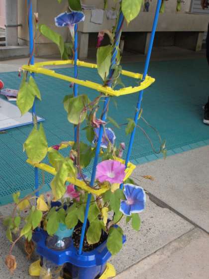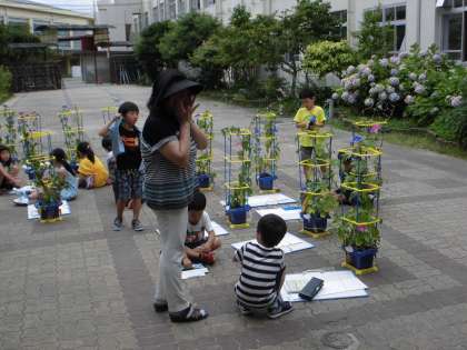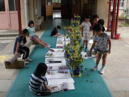 とても暑くなってきて,アサガオもたくさん花を咲かせてきました。1年生が,毎日たっぷりと水をあげているので,元気に育っています。花の数を1年生は,しっかりと数えていました。