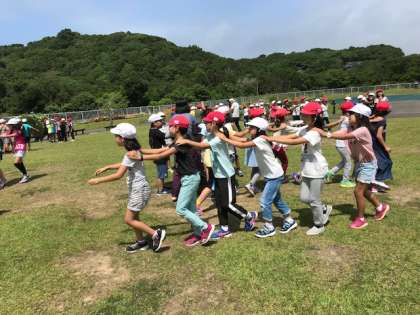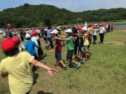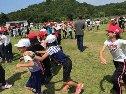 次のゲームは「貨物列車」です。二校のお友達が混ざり合って「貨物列車シュッシュッシュッ」と遊んでいます。大きな声もいっぱい出るようになりました。