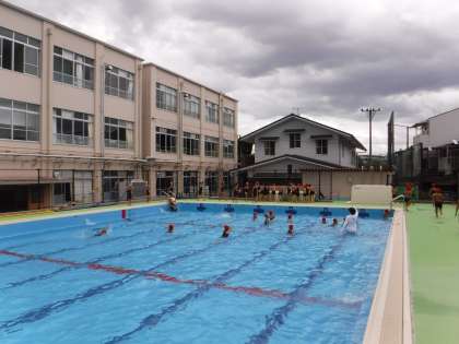 体育科「水あそび」では,今週から1単位時間の短い活動時間での学習になりました。これまでに体験してきた,顔つけ,伏し浮き,蹴伸びなどを使いながら,がんばっています。また,夏季休業中の水泳は1〜3年合同のため,タテの25mを活用して泳ぐ練習もしています。